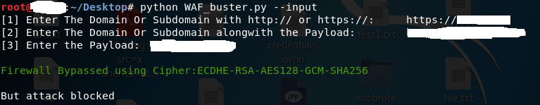 WAF-buster tool was created to Analyze the ciphers that are supported by the Web application firewall being used at the web server end. It works by first triggering SslScan to look for all the supported ciphers during SSL/TLS negotiation with the web server.After getting the text file of all the supported ciphers, then we use Curl to query web server with each and every Cipher to check which of the ciphers are unsupported by WAF and supported by Web server , if any such Cipher is found then a message is displayed that “Firewall is bypassed”.