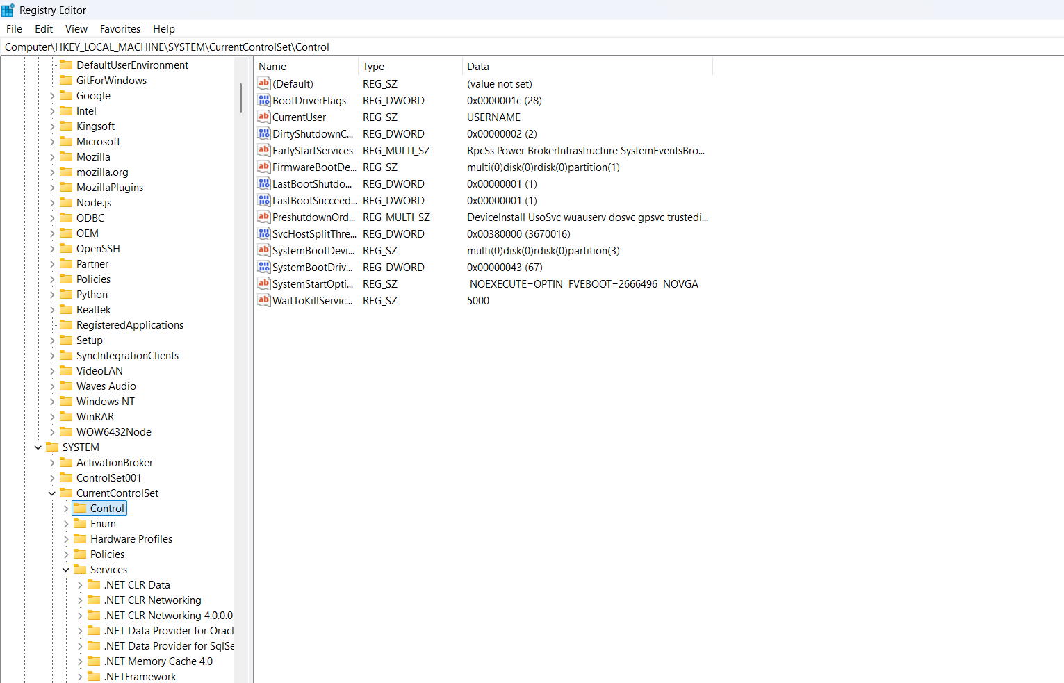 5. The Registry Editor will launch, displaying hives on the left and values on the right.