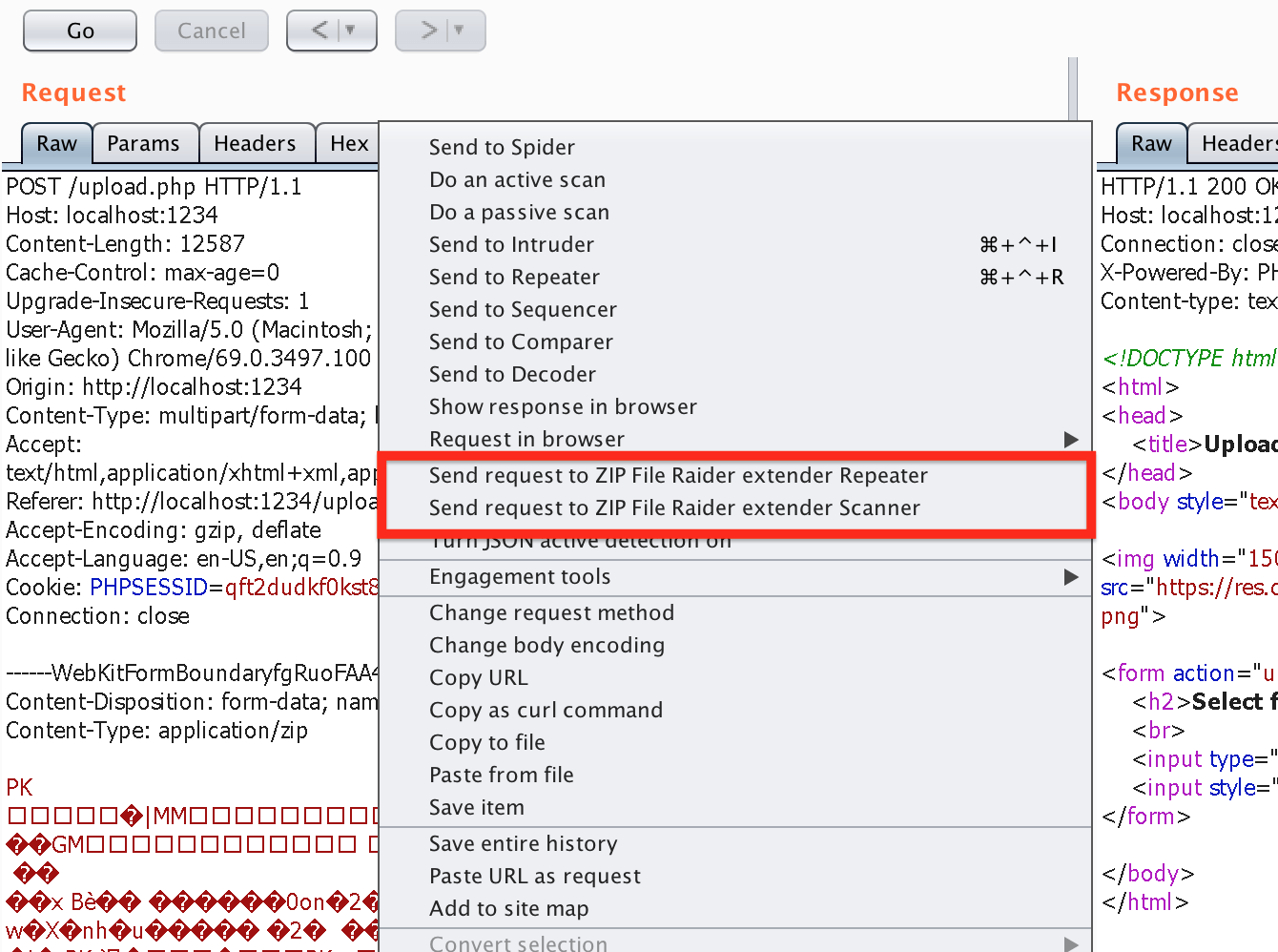 First, right click on the HTTP request with a compressed file in HTTP body and then select “Send request to ZIP File Raider extender Repeater” or Scanner.