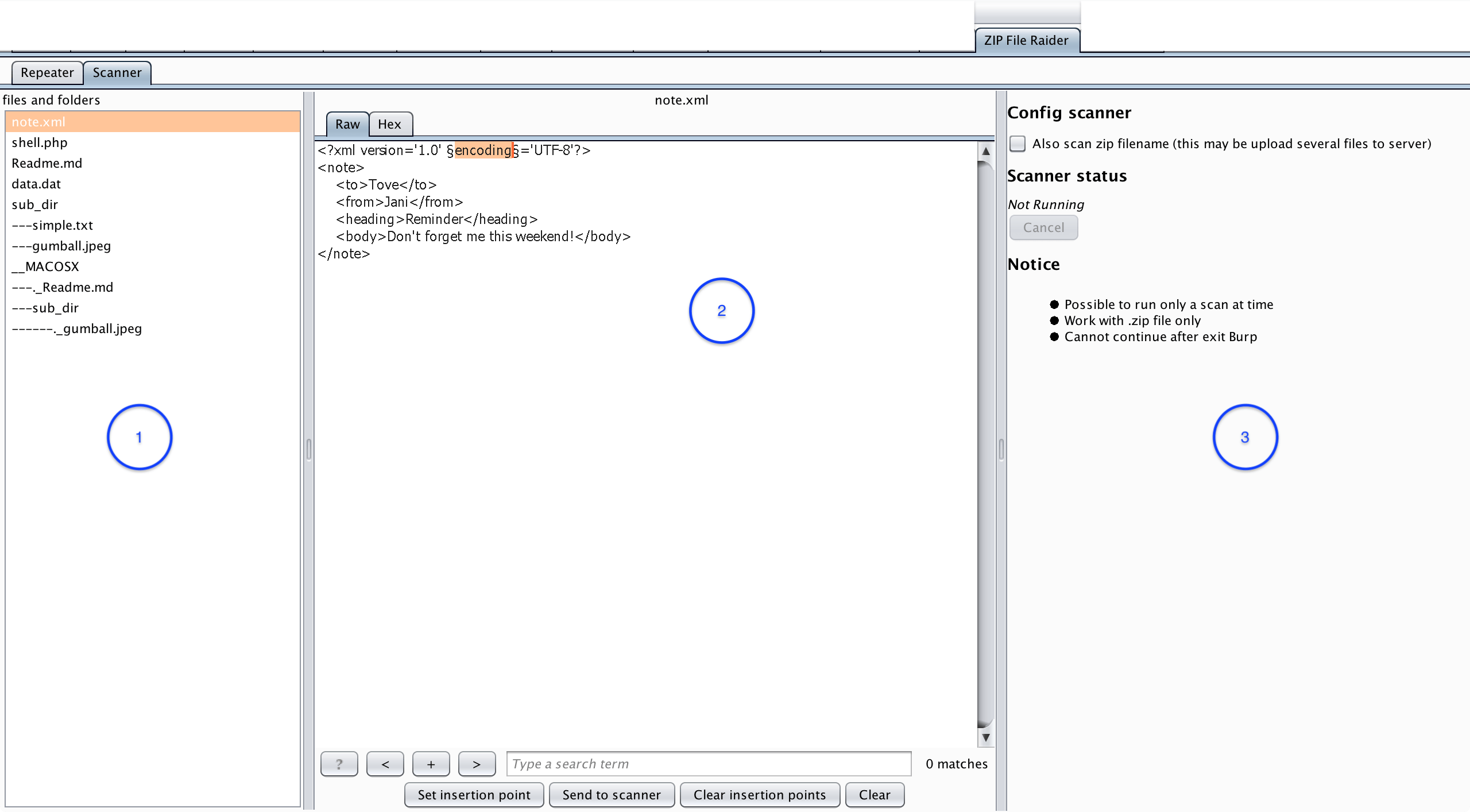 This Scanner tab is used for setting the §insertion point§ in the content of the ZIP file before sending it to Burp Scanner.
